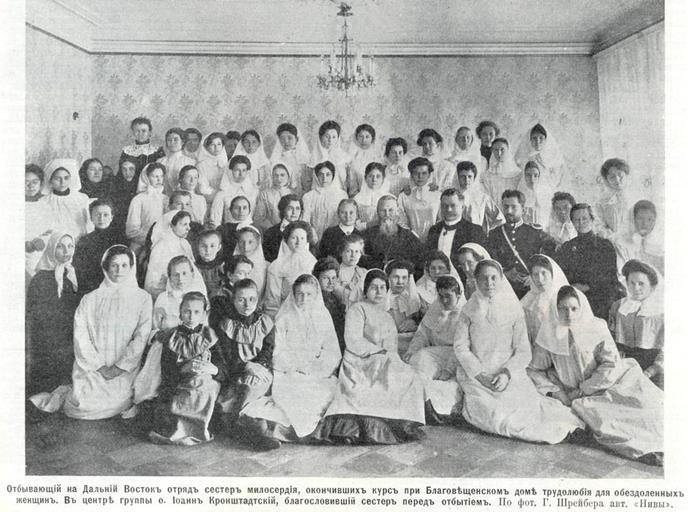 Keywords: Nurses from Blagoveshchensk with Saint John of Kronstadt.jpg en Nurses from Blagoveshchensk with Saint John of Kronstadt ru От яд сесте милосе дия окончивших ку сы п и Благовещенском Доме т удолюбия для обездоленных женщин пе ед отп авлением на Дальний Восток В цент е святой Иоанн К онштадтский Фотог афия пе иода Русско-Японской войны начало XX в begin 1900s http //www pravmir ru/krasnyj-krest-na-belom-fone-k-godovshhine-pervoj-zhenevskoj-konvencii-foto/ К асный к ест на белом фоне К годовщине пе вой Женевской конвенции ФОТО G Shreiber other versions Custom license marker 2015 06 14 PD-RusEmpire Uploaded with UploadWizard Saint John of Kronstadt House of Diligence Photographs uploaded by Alexander Krassotkin in 2015 History of Blagoveshchensk Groups of females Military nurses Nurses from Russia Women of Russia