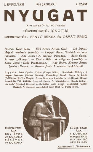 | Keywords: Nyugat1908-1.jpg Nyugat Hungarian literary journal - cover of the first issue 1908 A Nyugat folyóirat elsÅ‘ számának cÃmlapja 1908 own User Lelkesa PD-old ImageNote 1 278 433 89 15 474 772 2 Fülöp Ö Beck 1873 “1945 Beck Ö Fülöp 1873 “1945 ImageNoteEnd 1 ImageNote 2 314 360 111 15 474 772 2 Szabolcska Mihály 1861 “1930 ImageNoteEnd 2 ImageNote 3 255 146 97 22 474 772 2 Ignotus 1869 “1949 Ignotus 1869 “1949 ImageNoteEnd 3 ImageNote 4 151 175 138 23 474 772 2 Miksa FenyÅ‘ 1877 “1972 FenyÅ‘ Miksa 1877 “1972 ImageNoteEnd 4 ImageNote 5 316 175 133 23 474 772 2 ErnÅ‘ Osvát 1876 “1929 Osvát ErnÅ‘ 1876 “1929 ImageNoteEnd 5 ImageNote 6 180 238 77 18 474 772 2 Elek Artúr 1876 “1944 ImageNoteEnd 6 ImageNote 7 367 237 81 21 474 772 2 Jób Dániel 1880 “1955 ImageNoteEnd 7 ImageNote 8 225 255 93 21 474 772 2 Mld Lengyel Géza 1881 “1967 ImageNoteEnd 8 ImageNote 9 180 291 84 19 474 772 2 Révész Béla 1876 “1944 ImageNoteEnd 9 ImageNote 10 21 238 49 19 474 772 2 Ignotus 1869 “1949 Ignotus 1869 “1949 ImageNoteEnd 10 ImageNote 11 106 272 77 22 474 772 2 Endre Ady 1877 “1919 Ady Endre 1877 “1919 ImageNoteEnd 11 ImageNote 12 361 273 81 21 474 772 2 Szini Gyula 1876 “1932 ImageNoteEnd 12 ImageNote 13 19 309 88 18 474 772 2 Mld Szász Zoltán 1877 “1940 ImageNoteEnd 13 ImageNote 14 346 309 99 18 474 772 2 Mld Kemény Simon 1882 “1945 ImageNoteEnd 14 ImageNote 15 265 309 77 21 474 772 2 Endre Ady 1877 “1919 Ady Endre 1877 “1919 ImageNoteEnd 15 ImageNote 16 41 327 49 22 474 772 2 Ignotus 1869 “1949 Ignotus 1869 “1949 ImageNoteEnd 16 ImageNote 17 125 375 95 17 474 772 2 Gellért Oszkár 1882 “1967 ImageNoteEnd 17 ImageNote 18 368 671 81 15 474 772 2 crown korona ImageNoteEnd 18 ImageNote 19 218 360 88 17 474 772 2 Miksa FenyÅ‘ 1877 “1972 FenyÅ‘ Miksa 1877 “1972 ImageNoteEnd 19 ImageNote 20 93 360 72 17 474 772 2 Szini Gyula 1876 “1932 ImageNoteEnd 20 ImageNote 21 404 419 45 17 474 772 2 Gellért Oszkár 1882 “1967 ImageNoteEnd 21 ImageNote 22 63 434 46 15 474 772 2 Gellért Oszkár 1882 “1967 ImageNoteEnd 22 ImageNote 23 77 419 53 17 474 772 2 Ignotus 1869 “1949 Ignotus 1869 “1949 ImageNoteEnd 23 ImageNote 24 22 389 152 15 474 772 2 Margit Kaffka 1880 “1918 Fröhlichné Kaffka Margit 1880 “1918 ImageNoteEnd 24 ImageNote 25 165 405 89 15 474 772 2 Mld Lengyel Géza 1881 “1967 ImageNoteEnd 25 ImageNote 26 362 389 81 15 474 772 2 Miksa FenyÅ‘ 1877 “1972 FenyÅ‘ Miksa 1877 “1972 ImageNoteEnd 26 ImageNote 27 232 375 108 15 474 772 2 DezsÅ‘ Kosztolányi 1885 “1936 Kosztolányi DezsÅ‘ 1885 “1936 ImageNoteEnd 27 ImageNote 28 252 419 75 15 474 772 2 Géza Csáth 1887 “1919 Csáth Géza 1887 “1919 ImageNoteEnd 28 ImageNote 29 178 389 73 17 474 772 2 János Arany 1817 “1882 Arany János 1817 “1882 ImageNoteEnd 29 ImageNote 30 359 403 84 17 474 772 2 Bródy Miksa 1875 “1924 ImageNoteEnd 30 ImageNote 31 280 403 77 17 474 772 2 Comedy Theatre of Budapest VÃgszÃnház ImageNoteEnd 31 ImageNote 32 115 309 126 21 474 772 2 Sully Prudhomme 1839 “1907 Sully Prudhomme 1839 “1907 ImageNoteEnd 32 ImageNote 33 273 276 64 18 474 772 2 Hôtel Pimodan today Hôtel de Lauzun Hôtel Pimodan ma Hôtel de Lauzun ImageNoteEnd 33 ImageNote 34 256 237 90 19 474 772 2 Arturo Graf 1848 “1913 Arturo Graf 1848 “1913 ImageNoteEnd 34 ImageNote 35 175 329 86 18 474 772 2 Mld Greiner JenÅ‘ 1864 “1917 ImageNoteEnd 35 ImageNote 36 21 419 57 18 474 772 2 Bródy Sándor 1863 “1924 A dada 1904 ImageNoteEnd 36 Nyugat journals Lajos Hatvany Fülöp Beck Ö Endre Ady Kelemen Mikes ErnÅ‘ Osvát Ignotus Miksa FenyÅ‘ |