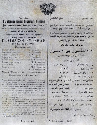 Keywords: O olmasın, bu olsun.jpg ru П ог амма одного из спектаклей музыкальной комедии О олмасын бу олсун If Not That One Then This One Шуша 1914 год Эльми а Абасова Узеи Гаджибеков Баку Азе байджанское госуда ственное издательство 1975 page 96 Типог афия Бабаджанова в Шуше 1914 PD-old Uzeyir Hajibeyov Music of Azerbaijan If Not That One Then This One Theatre of Azerbaijan |
