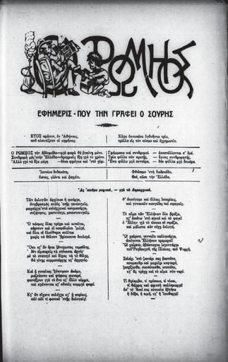 Keywords: O Romios tou Souri 1883 June 11.jpg el Πρώτη σελίδα α ό το φύλλο του Ρωμηού της 11ης Ιουνίου 1883 en The first page of the Romios satyrical newspaper in verse of 11 June 1883 1883-06-11 http //pleias lis upatras gr/index php/rwmios/index el Γεώργιος Σουρής George Souris 1853 - 1919 other versions PD-old-70-1923 Uploaded with UploadWizard Newspapers of Greece |