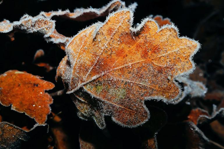 Keywords: oak leaf leaves ground winter frozen eiskristalle colorful color close light hoarfrost abstract