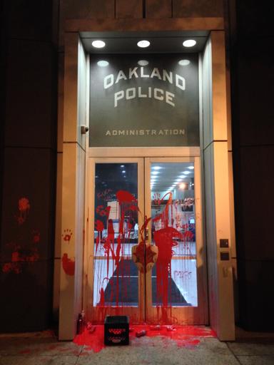 MAKE A MEME View Large Image Oakland Police Department door vandalized.jpg en The door to the Oakland Police Department administration office after being vandalized with red paint as part of protests against the shooting deaths of Alton Sterling and Philando Castile ...