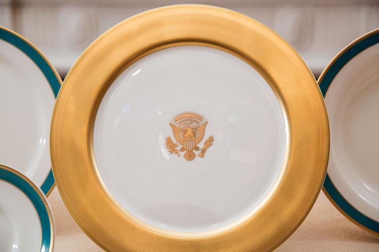 The White House must order new china about once every 10 years, depending on wear and tear. Recent past colors have included celadon green (Truman), white (with flowers; Johnson), red (Reagan), gold (Clinton), and gold (G.W. Bush). Although dark blue has been used on previous orders of White House china (both the F.D. Roosevelt and Wilson services used it), this type of light blue has never been used before on American state china.