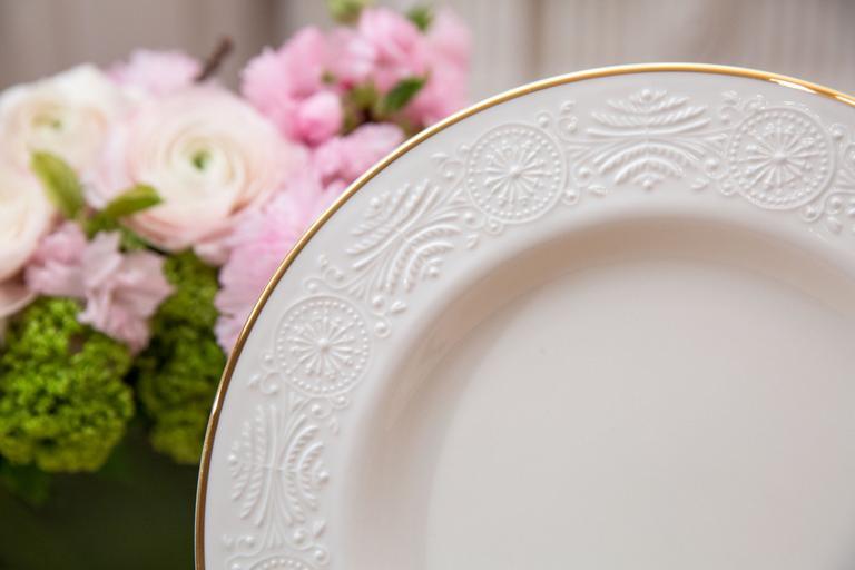 | Keywords: obama china service obamachinaservice white house china whitehousechina pickard china pickardchina 2015 white house china 2015whitehousechina porcelain american porcelain americanporcelain white house porcelain whitehouseporcelain obama porcelain obamaporcelain pastel depth of field A dinner plate in the Obama White House china service, which was introduced on April 27, 2015. This photograph was taken by a White House photographer. As the work of an employee of the federal government created in the performance of his/her duties, it is in the public domain. The White House must order new china about once every 10 years, depending on wear and tear. Recent past colors have included celadon green (Truman), white (with flowers; Johnson), red (Reagan), gold (Clinton), and gold (G.W. Bush). Although dark blue has been used on previous orders of White House china (both the F.D. Roosevelt and Wilson services used it), the type of light blue used by the Obamas has never been used before on American state china. The new Obama service porcelain was designed by First Lady Michelle Obama, with assistance from her friend, the interior designer Michael S. Smith. Planning for the new china began in the fall of 2011, and Obama consulted White House chefs (past and present), White House staff, and the Pickard China company of Illinois on the design and style of the porcelain, pieces, and color. White House dinners are growing ever-larger in size. Existing White House china settings are often used together, mixed and matched so that 400-, 500-, and even 600-setting dinners can be given. Michelle Obama was constrained by the need to design a china service that mixed well with existing china, but which reflected the Obamas' own personal style and tastes. The Obama china service made its debut on April 27, 2015. It was first used on April 28 for a state dinner for Japanese Prime Minister Shinzo Abe. Each setting has 11 pieces and there are 320 settings, for a total of 3,520 pieces in the entire service. The "service plate" or "charger" is the largest piece in the set at 14 inches. A charger is designed to be a placeholder, so that each diner knows to "sit here". As the meal is served, additional elements of the service are placed atop the charger. The charger helps protect the tablecloth from spills, but it also helps act as an aesthetic backdrop to the other pieces of china. The Obama chargers feature a lip of gold gilt, impressed with a fret (Greek key pattern). There is a narrow band of plain gilt on the rim next to the lip, with the rest of the rim in fluted gold gilt. A narrow band of plain gold gilt is placed just inside the well. In the center of the charger is the Presidential coat of arms in gold. The seal should be the first thing the diner sees when they are seated. Each dinner plate is 12 inches in diameter. The lip of the dinner plate is plain gold gilt. The broad rim of the plate lacks gilding or color, and is decorated with pinwheels and fronds in bas-relief. The bas-relief design was taken from an Empire-style china service purchased by then-Secretary of State James Madison in 1806. The bas-relief element is unique to White House china, which has never featured anything like it before. The Obama china service also includes a "second course" 11-inch dinner plate, a 10-inch luncheon plate, a 9-inch salad plate, a 9-inch dessert plate, a 7-inch tureen plate, and a 6-inch saucer. Each of these plates has a lip in gold gilt, impressed with a fret-oval-and-dart motif. Each motif is separated by a double row of dots. The rim of the plate is in a new color designed specifically for the Obama china service. This color is named "Kailua Blue," a bright blue inspired by the hue of the sea in President Barack Obama's home state of Hawaii. The fluted rim of blue is followed by a delicate inner line of gold gilt which completes the decoration. Only about half the rim is taken up by design and color. The dessert plate, the last plate the diner should see, also has the Presidential coat of arms in gold gilt in the center. Each setting comes with a coffee cup. The cup has a lip of plain gold gilt, followed by a narrow band of gold gilt in a dart-oval-dart motif set perpendecular to the lip. This is followed by a band of fluted Kailua blue, and then a delicate band of plain gold gilt again. Each cup has the Presidential coat of arms; if held by the right hand, the coat of arms faces the guest. Unique to the Obama china service is an individual tureen. Although large tureens have been part of White House china before, this is the first time an individual-sized tureen has been designed. The tureen reflects a more modern style of dining, which emphasizes soups, small entrees, or desserts requiring more than a bowl but not a large tureen. Each tureen is small, about 6 inches across. Handles on the side of the tureen are plain, consisting of a scroll with one acanthus leaf above and three below (helping to reinforce the scroll). Each tureen is about 4 inches deep. The lip of the tureen is plain. The rim is designed with the same plain pinwheels-and-fronds design in bas-relief. Below the rim, the side of the tureen is decorated with a narrow band of Kailua blue edged in a delicate line of gold gilt. The lid of the tureen is plain, with a mushroom-motif handle. The cap of the mushroom is fluted, with a botton topping the cap. Pickard China produced the dinnerware. The tureen was incredibly difficult to make. It took workers more than a year and innumerable trials to produce the tureen. The china service was paid for by the White House Historical Association -- a private foundation established by Jacqueline Kennedy to buy furniture, china, and decorative and fine art for the White House. The service cost $367,258. A dinner plate in the Obama White House china service, which was introduced on April 27, 2015. This photograph was taken by a White House photographer. As the work of an employee of the federal gove