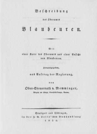 | Keywords: Oberamt Blaubeuren 002.jpg de Dies ist ein Scan des Buches en This is a scan of the book Beschreibung des Oberamts Blaubeuren Cotta Stuttgart und Tübingen 1830 Blaubeuren Stadt im Alb-Donau-Kreis /Baden-Württemberg Source de Scan einer Faksimileausgabe Bissinger Magstadt 1976 ISBN 3-7644-0007-2 en Scan from facsimile edition Bissinger Magstadt 1976 ISBN 3-7644-0007-2 Date 1830 Author Prof Johann Daniel Georg von Memminger 1773-1840 Oberamt Blaubeuren PD-old | ||||