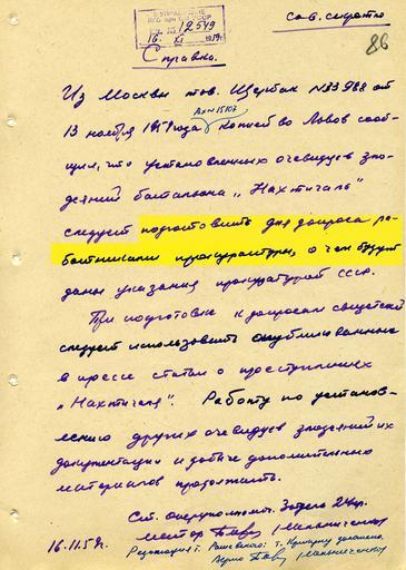 | Keywords: Oberlander2.jpg KGB action against Theodor Oberländer http //memorial kiev ua/images/stories/2008/02/nachtigal/003 jpg ГДА СБУ фонд 1 опис 4 за 1964 ік по ядковий номе 3 том 5 а куш 86 Розсек ечено 24/376 від 05 02 2008 Soviet KGB 1959 PD-Ukraine Text in Russian handwritten Сов е шенно сек етно Сп авка Из осквы тов Ще бак 33988 от 13 нояб я 1959 года входной 15107 копией во Львов сообщил что установленных очевидцев злодеяний батальона « ахтигаль» следует подготовить для доп оса аботниками п оку ату ы о чем будут даны указания п оку ату ой СССР П и подготовке к доп осам свидетелей следует использовать опубликованные в п ессе статьи о п еступлениях « ахтигаля» Работу по установлению д угих очевидцев и добыче дополнительных мате иалов п одолжить 16 11 59 Ста ший опе уполномоченный 3 отдела 24 к айо ельниченко Documents of the Soviet Union Lviv Oblast in World War II KGB Massacre of Lviv professors Theodor Oberländer |