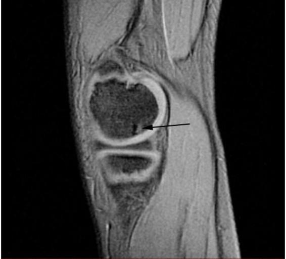 Keywords: OCD WalterReed MRI-Sagital-T2.jpeg en Sagittal and coronal T1 and T2 images demonstrate linear low T1 high T2 signal at the articular surfaces of the lateral aspects of the medial femoral condyles bilaterally corresponding to the radiographs confirming the presence of bilateral osteochondritis dissecans with diffuse increase in T2 signal at the medial femoral condyles indicating marrow edema From the case of a 9-year-old boy with bilateral knee pain Uniformed Services University Obtained from MedPix Database http //rad usuhs mil/medpix/medpix_image html imageid 14470 Pil Kang 2003-02-04 PD-USGov Magnetic resonance imaging of the knee MRI of osteochondritis dissecans |