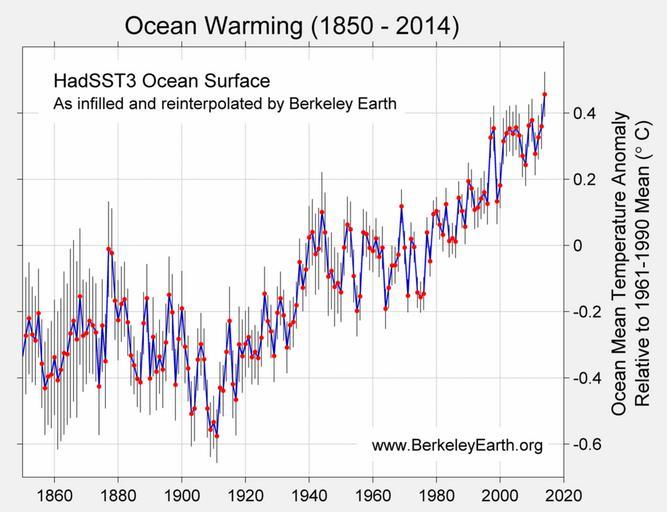 | Keywords: Ocean Surface Averages (1850-2014).jpg ber Temperaturveränderung über Ozeanflächen rel zu Mittelwert 1961-1990 2014 0 457 ±0 068°C 2010 0 378 ±0 065°C 2009 0 362 ±0 064°C 2013 0 360 ±0 051°C 2005 0 356 ±0 068°C 1998 0 354 ±0 069°C 2003 0 353 ±0 069°C 2002 0 339 ±0 070°C 2004 0 337 ±0 067°C 2006 0 332 ±0 066°C http //static berkeleyearth org/memos/Global-Warming-2014-Berkeley-Earth-Newsletter pdf 2015-01 Berkeley Earth PD-author Berkeley-Earth Reuse Policy http //berkeleyearth org/contacthttp //berkeleyearth org/faq reuse The authors of the material available on the Berkeley Earth website www berkeleyearth org grant permission free of charge to authors readers and third parties to reproduce their materials as part of another publication or entity with proper sourcing to Berkeley Earth and by additionally providing a link to the Berkeley Earth website http //www berkeleyearth org Berkeley EarthGlobal warming graphsSea surface temperature maps 201412 |