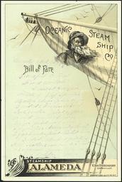 Keywords: sketch drawing text photo border A breakfast menu, listing: Breakfast delight [?], fried mullets, smoked snapper, fillets of beef Spanish, mutton chops and potato chips, broiled chicken on toast, pork cutlets [with] fried apples, fried [bananas?] sausage, tripe fried in butter, ... liver bacon and ..., eggs ... fried and boiled .., boiled and mashed potatoes, hot rolls ...toast, currant ... tea, coffee, cocoa. The menu is handwritten on to a pre-printed sheet showing the head and shoulders of an old bearded sailor appearing on the sail of a ship. Louisa Jane Spotswood Morice (nee Seddon) was travelling on the 'Alameda' in 1897, to England for Queen Victoria's diamond jubilee celebrations. Quantity: 1 colour photo-mechanical print(s) on flyer.. Physical Description: Lithograph on flier, 228 x 152 mm. Provenance: Similar menu has "Morice album" pencilled on the verso.From the album of Charles George Frederick Morice. Oceanic Steamship Company. Oceanic Steam Ship Company :Steamship Alameda, K Van Oterendorp, commander. Bill of fare. [Sunday April 25, 1897?]. Schmidt Label & Lith Co. S.F. [1897?]. Ref: Eph-A-SHIP-1897-02. Alexander Turnbull Library, Wellington, New Zealand. natlib.govt.nz/records/22710222 A breakfast menu, listing: Breakfast delight [?], fried mullets, smoked snapper, fillets of beef Spanish, mutton chops and potato chips, broiled chicken on toast, pork cutlets [with] fried apples, fried [bananas?] sausage, tripe fried in butter, ... liver bacon and ..., eggs ... fried and boiled .., boiled and mashed potatoes, hot rolls ...toast, currant ... tea, coffee, cocoa. The menu is handwritten on to a pre-printed sheet showing the head and shoulders of an old bearded sailor appearing on the sail of a ship. Louisa Jane Spotswood Morice (nee Seddon) was travelling on the 'Alameda' in 1897, to England for Queen Victoria's diamond jubilee celebrations. Quantity: 1 colour photo-mechanical print(s) on flyer.. Physical Description: Lithograph on flier, 228 x 152 mm. Provenance: Similar menu has "Morice album" pencilled on the verso.From the album of Charles George Frederick Morice. Oceanic Steamship Company. Oceanic Steam Ship Company :Steamship Alameda, K Van Oterendorp, commander. Bill of fare. [Sunday April 25, 1897?]. Schmidt Label & Lith Co. S.F. [1897?]. Ref: Eph-A-SHIP-1897-02. Alexander Turnbull Library, Wellington, New Zealand. natlib.govt.nz/records/22710222