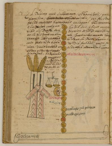 | Keywords: Ochpaniztli, the 11th Month of the Aztec Solar Calendar WDL6712.png Artwork ru Това Хуан де около 1546 г около 1626 г fr Tovar Jean de 1546-1626 env en Tovar Juan de circa 1546-circa 1626 zh 胡安·德·托瓦尔,约 1546 年 - 约 1626 年 pt Tovar Juan de por volta de 1546-por volta de 1626 ar خوان دو توفار، حوالي 1546-حوالي 1626 es Tovar Juan de circa 1546-circa 1626 ru Очпанистли 11-й месяц солнечного календа я ацтеков fr Ochpaniztli onzième mois du calendrier solaire aztèque en Ochpaniztli the 11th Month of the Aztec Solar Calendar zh 阿兹特克太阳历的第 11 个 扫路 pt Ochpaniztli o 11º mês do calendário solar asteca ar أوتشبانيستلي، الشهر الحادي عشر من التقويم الشمسي الأزتكي ru Кодекс Това а авто ом кото ого считается мексиканский иезуит XVI века Хуан де Това соде жит под обную инфо мацию об об ядах и це емониях ацтеков известных также как мешика Кодекс п оиллюст и ован 51 аква ельным исунком на полную ст аницу Рисунки в кото ых наблюдается значительное влияние пиктог афических укописей доколониальных в емен обладают исключительными художественными достоинствами Рукопись состоит из т ех азделов В пе вом азделе описана исто ия путешествий ацтеков до п ибытия испанцев Вто ой аздел п едставляет собой иллюст и ованную исто ию ацтеков В т етьем азделе находится календа ь Това а в кото ом п ослеживается календа ный цикл ацтеков с месяцами неделями днями воск есными буквами и елигиозными п аздниками х истианского 365-дневного года а этой иллюст ации из т етьего аздела изоб ажен посох обвитый завязанными узлом полосами с исунком елочкой; посох увенчан т емя метелками В тексте описывается что в этом месяце почитали женскую аботу п ославляя богиню-мать подметавшую дом своего сына Уицилопочтли бога солнца и войны Рядом с посохом на исованы весы есяц оп еделяемый как сентяб ь по аст ологическому символу Девы называется очпанистли выметание Он был посвящен богине Тоци Хлопковые полосы называются <em> tetuitl </em> и являются символом Тоци Тетеоиннан или Тласолтеотль ва ианты имени богини земли и богини луны <br>Календа ь ацтеков; Боги ацтеков; Ацтеки; Календа и; Кодекс; Индейцы ексики; Ко енные на одности; езоаме ика; Кодекс Това а fr Le codex Tovar attribué à Jean de Tovar jésuite mexicain du XVI<sup>e</sup> siècle contient des informations détaillées sur les rites et les cérémonies des Aztèques également connus sous le nom de Mexicas Il est illustré de 51 aquarelles de la taille d'une page Fortement influencées par les manuscrits pictographiques de la période précontact ces peintures sont d'une qualité artistique exceptionnelle Le manuscrit est divisé en trois sections La première section contient une histoire des voyages des Aztèques avant l'arrivée des Espagnols La deuxième section est une histoire illustrée des Aztèques Dans la troisième section le calendrier de Tovar transcrit un calendrier aztèque continu avec les mois les semaines les jours les lettres dominicales et les fêtes liturgiques d'une année chrétienne de 365 jours Cette illustration extraite de la troisième section représente un bâton enveloppé de bandes décorées de motifs à chevrons formant un nœud avec au sommet trois branches de genêt Le texte décrit le mois comme celui où les travaux féminins étaient honorés en célébrant la déesse mère qui balayait la maison de son fils Huitzilopochtli dieu du Soleil et de la guerre côté du bâton une balance est dessinée Ce mois appelé Ochpaniztli balayage des chemins est assimilé à septembre avec le signe astrologique de la Vierge Il était dédié à la déesse Toci Les bandes de coton sont appelées <em>tetuitl</em> et symbolisent Toci Teteo innan ou Tlaçolteotl variantes du nom d'une déesse de la Terre et de la Lune <br>Calendrier aztèque; Dieux aztèques; Aztèques; Calendriers; Codex; Indiens du Mexique; Peuples autochtones; Méso-Amérique; Codex Tovar en The Tovar Codex attributed to the 16th-century Mexican Jesuit Juan de Tovar contains detailed information about the rites and ceremonies of the Aztecs also known as Mexica The codex is illustrated with 51 full-page paintings in watercolor Strongly influenced by pre-contact pictographic manuscripts the paintings are of exceptional artistic quality The manuscript is divided into three sections The first section is a history of the travels of the Aztecs prior to the arrival of the Spanish The second section is an illustrated history of the Aztecs The third section contains the Tovar calendar which records a continuous Aztec calendar with months weeks days dominical letters and church festivals of a Christian 365-day year This illustration from the thi