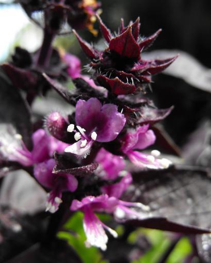 Keywords: Ocimumbasilicumdarkopal.jpg en Ocimum basilicum 'Dark Opal' in the Botanical Building in Balboa Park San Diego California USA Identified by sign own Stickpen 2009-09-01 released to public domain Close-ups of Ocimum basilicum flowers