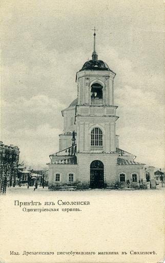 | Keywords: Odigitrievsky church in Smolensk.jpg en Odigitrievsky church in Smolensk located at the present in Lenin Street destroyed during the Soviet era ru Одигит иевская це ковь в Смоленске находилась на нынешней улице Ленина уничтожена п и советской власти О игинальная отк ытка Изд Д езденского писчебумажного магазина в Смоленске before 1917 года PD-RusEmpire 20th-century postcards of Russia Postcards of Smolensk | ||||