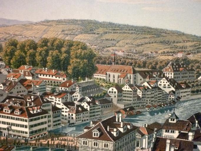 Keywords: Oetenbach 1825.jpg Kloster Oetenbach auf dem Panorama der Stadt Zürich von Franz Schmid von 1825 Zentralbibliothek Zürich 1825 Franz Schmid upload by Adrian Michael PD-old Kloster Oetenbach