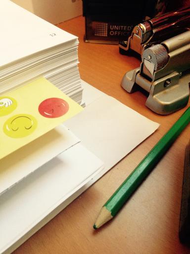 Keywords: office pencil desktop sticker paper folios work stapler table