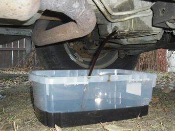 Keywords: Oil Change oil pan 2005 gmc suv.JPG en Oil being drained from a GMC Sport Utility Vehicle own Myke Waddy 2009-11-08 Automobile maintenance Motor oil Oil pan