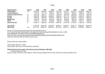 Keywords: Oil consumption per day by region from 1980 to 2006 original data.png Oil consumption in daily barrels per region from 1980 to 2006 This contains raw figures copied from the region total sections of U S Energy Information Administration's file RecentPetroleumConsumptionBarrelsperDay xls with Canada and Mexico created as a new region These figures were used to create the charts Image Oil consumption per day by region from 1980 to 2006 no labels svg and Image Oil consumption per day by region from 1980 to 2006 svg Snapshots of those two charts are included here Vertical extents indicate thousands of barrels of oil consumed per day and the horizontal scale shows years from 1980 to 2006 From bottom to top the regions are United States in red Canada and Mexico in orange Central and South America in brown Europe in blue Eurasia in cream Middle East in pink Africa in grey and Asia and Oceania in yellow Oil_consumption_per_day_by_region_from_1980_to_2006 pdf 2010-02-28 09 01 UTC Oil_consumption_per_day_by_region_from_1980_to_2006 pdf 84user derivative work Sigbert <span class signature-talk >talk</span> extracted original data sheet and rotated it sigbert Oil_consumption_per_day_by_region_from_1980_to_2006 pdf original upload log This image is a derivative work of the following images File Oil_consumption_per_day_by_region_from_1980_to_2006 pdf licensed with PD-user 2008-10-25T15 56 02Z 84user 1240x1753 180688 Bytes <nowiki> Oil consumption in daily barrels per region from 1980 to 2006 This contains raw figures copied from the region total sections of U S Energy Information Administration's file RecentPetroleumCo</nowiki> Uploaded with derivativeFX Area charts Economic trends Petroleum