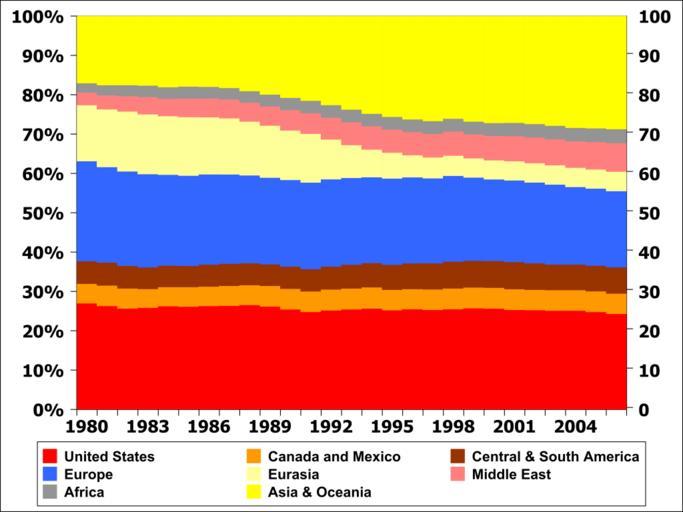 | Keywords: Oil consumption per day by region from 1980 to 2006 solid3.svg Oil consumption as percentage per region from 1980 to 2006; vertical extents indicate percentage of world total oil consumption and the horizontal scale shows years from 1980 to 2007 en wikipedia 84user manually<br/> original text 1 I 84user created this work using the excel file RecentPetroleumConsumptionBarrelsperDay xls from the U S Energy Information Administration's web page http //tonto eia doe gov/dnav/pet/pet_pri_wco_k_w htm direct link http //www eia doe gov/emeu/international/RecentPetroleumConsumptionBarrelsperDay xls and using Open Source Gnumeric 1 9 1 to produce the chart Related images en Image Oil consumption per day by region from 1980 to 2006 solid2 svg - same chart but with vertical lines 2008-10-24 <br/> thumb center same stacked chart with English labels clr 84user self original upload log page en wikipedia Oil_consumption_per_day_by_region_from_1980_to_2006_solid3 svg Area charts Economic trends Petroleum economics and industry Petroleum statistics |