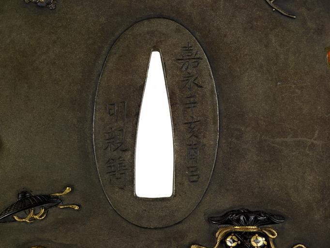 View Original:Oishi_Akichika_-_Tsuba_with_the_Treasures_of_the_Seven_Gods_of_Good_Fortune_-_Walters_51215_-_Mark.jpg (1799x1350)