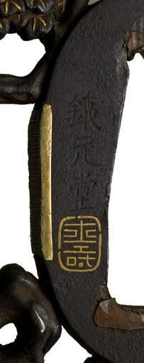 Keywords: Okamoto Naoshige - Tsuba with Two Figures with a Chinese Lion-Dog - Walters 51349 - Mark A.jpg The openwork design on this tsuba features two figures standing at the right The one in the rear carries a quiver of arrows and a bow He is blowing a long horn The figure in front holds a Chinese style lion-dog shishi on a leash This animal did not exist but is derived from Chinese and Japanese interpretations of stories and paintings of lions in India ca 1765 Edo iron gold copper shakudo cm 7 6 88 0 5 accession number 51 349 11246 Henry Walters Baltimore date and mode of acquisition unknown Walters Art Museum Henry Walters Acquired by Henry Walters Signature Tetsugendô; Seal Kotobuki place of origin Kyoto Japan Walters Art Museum license Tsuba in the Walters Art Museum Okamoto Naoshige Media contributed by the Walters Art Museum needs category review |