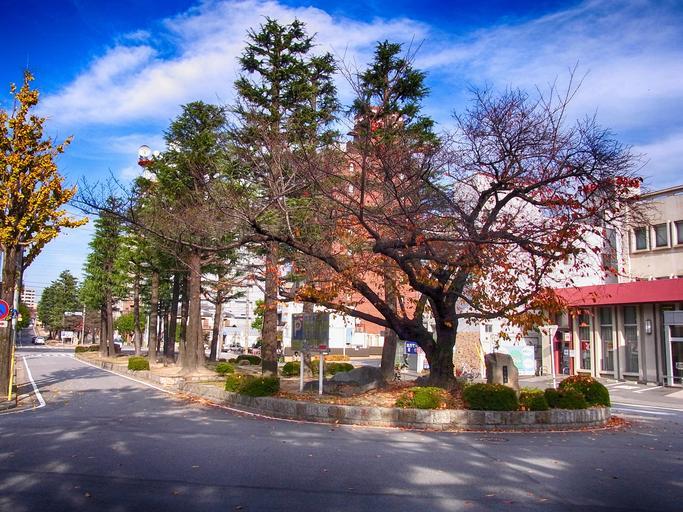 Keywords: okazaki japan city street trees outside fall autumn buildings architecture sky clouds cities urban