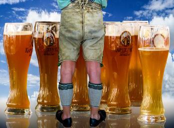 Keywords: oktoberfest wheat beer beer glass ozapft is leather pants costume stocking calves brogues drink foam bavaria tradition wheat beer sky blue festival thirst brewery beer garden