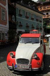 Keywords: old car citroen orange white vehicle transport antique car veteran retro french old timer c3 city street