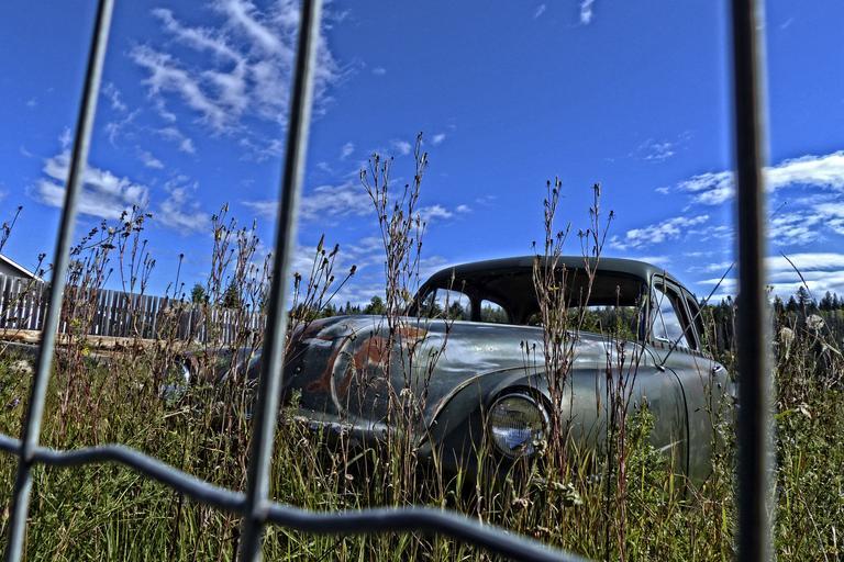 Keywords: old car old timer vintage hdr chicken wire fence high grass meadow metal rusty technology vehicle