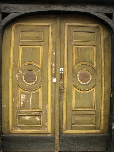 Keywords: old door 1700 century panels yellow green worn half-timbered frame building part special wood architecture denmark