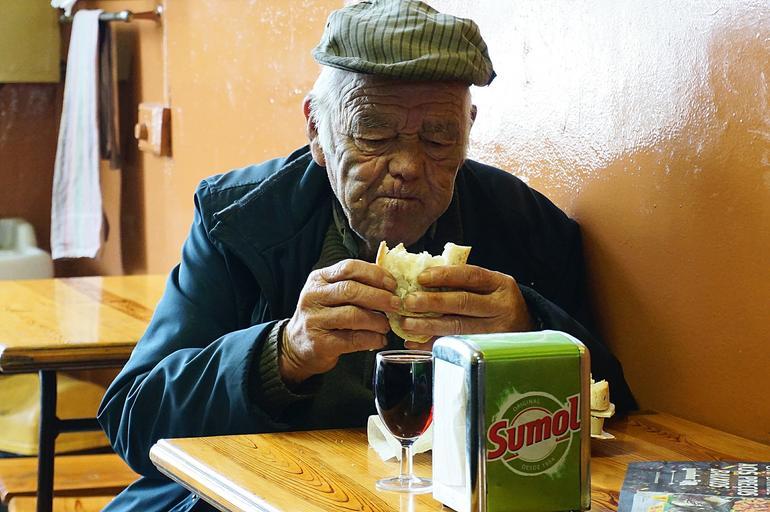 Keywords: old generation 80s senior old people old man eating cafe bread