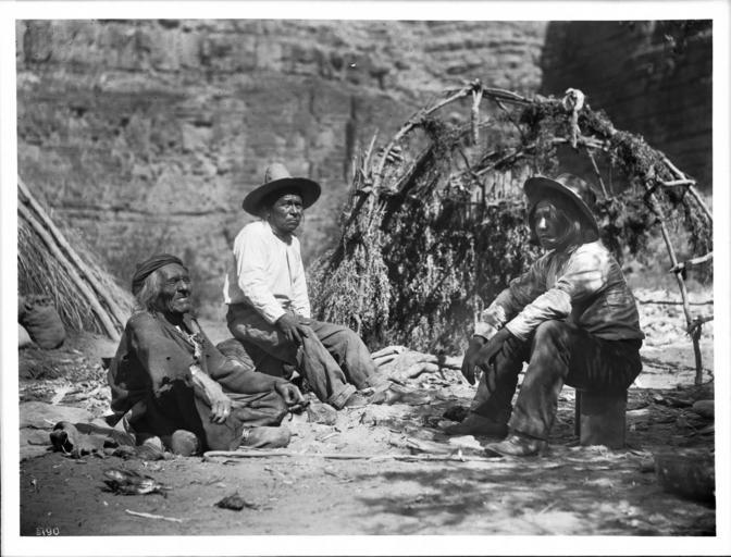 | Keywords: Old Havasupai Indian man telling stories to two other men sitting around a campfire, ca.1899 (CHS-3790).jpg en <br> Old Havasupai Indian man telling stories to two other men sitting around a campfire ca 1899 Photograph of an old Havasupai Indian man telling stories to two other men sitting around a campfire ca 1899 He sits crosslegged on the ground at left The other two men sit on small objects a rock a box close to the ground They both wear hats; whereas the old man wears a cloth wrapped around his head Behind them stands the rough lattice wood framework of a small dome-shaped structure A vertical canyon wall is in the background Call number CHS-3790 Photographer James George Wharton Filename CHS-3790 Coverage date circa 1899 Part of collection California Historical Society Collection 1860-1960 Type images Part of subcollection Title Insurance and Trust and C C Pierce Photography Collection 1860-1960 Repository name USC Libraries Special Collections Format glass plate negatives Microfiche number 1-167- Archival file chs_Volume95/CHS-3790 tiff Repository address Doheny Memorial Library Los Angeles CA 90089-0189 Geographic subject country USA Format aacr2 2 photographs glass photonegative photoprint b w ; 17 x 22 cm Rights Digitally reproduced by the USC Digital Library; From the California Historical Society Collection at the University of Southern California Subject adlf tribal areas Project USC Accession number 3790 Repository email specol usc edu Contributing entity California Historical Society Date created circa 1899 Publisher of the digital version University of Southern California Libraries Format aat photographic prints; photographs Legacy record ID chs-m16375; USC-1-1-1-13517 Access conditions Send requests to address or e-mail given Phone 213 821-2366; fax 213 740-2343 Subject file heading Indians -- Havasupai Subject lcsh Indians of North America; Havasupai Indians; Men; Storytellers; Clothing and dress Subject Havasupai Indians circa 1899 date created James George Wharton http //digitallibrary usc edu/cdm/ref/collection/p15799coll65/id/16314 PD-old-70-1923 Images from USC Digital Library uploaded by Fæ California Historical Society Collection 1860-1960 Glass plate negatives Havasupai Photographs by George Wharton James |