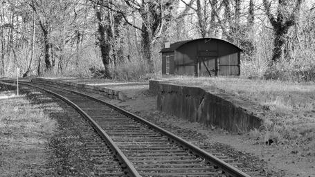 Keywords: old railway station leave railroad tracks railroad track platform wild