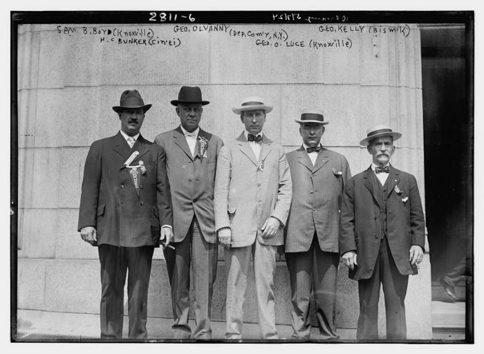 | Keywords: Olvany 4101089538 9c4b2723e3 o.jpg en wikipedia 2012 January 12 Bain News Service publisher Samuel Becket Boyd II George Washington Olvanny Kelly Henry Clemons Bunker and George O Luce in 1913 in New York City They may have been meeting for the dedication of the Firemen's Memorial in Riverside Park in Manhattan in New York City on September 5 1913 Note that they have shared pins and pennants with each other 1 negative glass ; 5 x 7 in or smaller Notes Title from unverified data provided by the Bain News Service on the negatives or caption cards Forms part of George Grantham Bain Collection Library of Congress Format Glass negatives Rights Info No known restrictions on publication Repository Library of Congress Prints and Photographs Division Washington D C 20540 USA hdl loc gov/loc pnp/pp print General information about the Bain Collection is available at hdl loc gov/loc pnp/pp ggbain Persistent URL hdl loc gov/loc pnp/ggbain 14085 Call Number LC-B2- 2811-6 ggbain 14085 en wikipedia 2009-11-19 Richard Arthur Norton 1958- wikipedia en Cropped images multiple image center center Samuel Becket Boyd II 1865-1929 circa 1913 in Manhattan png Henry Clemons Bunker 1856-1938 circa 1913 in Manhattan png George Washington Olvany 1876-1952 circa 1913 in Manhattan png clear People Samuel Becket Boyd II 1865-1929 was the fire chief of Knoxville Tennessee who died of a heart attack in the line of duty in 1929 Henry Clemons Bunker 1856-1938 was the fire chief of Cincinnati Ohio from 1912 to 1916 George Washington Olvany 1876-1952 was the deputy fire chief of New York City New York George O Luce 1876-1922 was the fire chief of Ilion New York in 1918 In the image he is incorrectly identified as being from Knoxville Tennessee but the fire chief of Knoxville is already identified George Kelly fireman of Bismarck North Dakota George Washington Olvany 1876-1952 He was the deputy New York City Fire Commissioner and leader of Tammany Hall <ref name time> cite news Death of Brennan http //www time com/time/magazine/article/0 9171 881173 00 html George Washington Olvany under the careful guidance of Governor Smith has succeeded Tammany Boss Murphy Frank Hague is in power in New Jersey Time magazine August 20 1928 2009-08-18 </ref> He resigned from Tammany Hall in 1929 <ref> cite news Olvany Out http //www time com/time/magazine/article/0 9171 846323 00 html ixzz0XLPpCjRc 'Because of ill health and on advice of physicians I resign as leader of Tammany Hall George W Washington Olvany ' Time magazine March 25 1929 2009-11-19 </ref> Samuel Becket Boyd II 1865-1929 He was born on March 20 1865 in Abingdon Virginia to Samuel Becket Boyd I 1828-1890 and Isabella Reed 1831-1907 <ref name obit/><ref> cite web http //dlc lib utk edu/spc/view docId ead/0012_002387_000000_0000/0012_002387_000000_0000 xml Samuel Becket Boyd papers 2015-05-14 University of Tennessee </ref> He married Julia Harrison 1881-1957 around 1852 He joined the fire department in 1900 <ref name obit/> He died on March 29 1929 of a heart attack in Knoxville Tennessee after a fire while in route to the hospital <ref name obit> cite news Funeral Services to Be Held Monday for Chief Boyd Died After Collapse After Fire http //www findagrave com/cgi-bin/fg cgi page pv GRid 62597802 PIpi 109179018 Knoxville News Sentinel March 30 1929 2015-05-14 </ref> He was buried in the Old Gray Cemetery in Knoxville Tennessee George O Luce 1876-1922 George received his basic education in the Ilion schools where he excelled in tool making This landed him a job at the Remington Arms Company where he worked at this trade His father had opened and operated a wholesale liquor establlishment and at the time of his father's passing he gave up his job at Remington to take over the business as the manager He held this position until 1918 when he became the elected fire chief of Ilion He had always been interested and involved in fire fighting While at Remington he was the chief of the fire brigade He would remain with the fire department the rest of his life belonging to numerous fire associations such as the New York State Fire Chief's Association and the International Fire Chief's Association He was active in the Catholic church the Elks 1444 and Nikomas Tribe of the Improved Order of Red Men at Ilion Henry Clemons Bunker 1856-1938 He was the fire chief of Cincinnati Ohio from 1912 to 1916 References reflist PD-Bain Original upload log page en wikipedia Olvany_4101089538_9c4b2723e3_o jpg 2009-11-19 21 35 Richard Arthur Norton 1958- 1024×749× 140499 bytes <nowiki>Bain News Service publisher Boyd George Washington Olvanny Kelly Bunker Luce between ca 1910 and ca 1915 1 negative glass ; 5 x 7 in or smaller Notes Title from unverified data provided by the Bain News Service on the negatives o</nowiki> Black and white group photographs of men Black and white photographs in the 1910s 1913 in New York City Samuel Becket Boyd II George Washington Olvany George Grantham Bain Collection |
