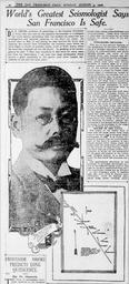 | Keywords: Omori San Francisco Call 05August1906.jpg  en Image of Fusakichi Omori and his hand-drawn map of the San Andreas Fault accompanying an article he wrote for the San Francisco Call newspaper 05 August 1906 Dr Omori was a pioneering seismologist and the head of the Imperial Committee to investigate the 1906 San Francisco Earthquake He traveled the full length of the map shown describing and photographing effects of the earthquake on California landscapes homes and buildings San Francisco Call 05 August 1906 http //chroniclingamerica loc gov/lccn/sn85066387/1906-08-05/ed-1/seq-48/;words OMORI+Omori Fusakichi Omori 30 October 1868 - Fukui 8 November 1923 - Tokyo 1906-08-05 http //www flickr com/photos/gilsonrome/5531231466/ Creative Commons 2 0 license Taken from original microfilm version highlighting the diagram of the San Andreas Fault and the portrait of Dr Omori PD-old 1906 in San Francisco 1906 newspapers Black and white photographic portraits of men Fusakichi Ōmori Newspapers of California |