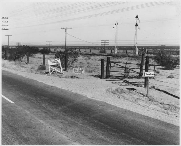 | Keywords: On Highway 84, Pinal County, Arizona. Ranch advertisement during cotton harvest. Highway signs readi . . . - NARA - 522493.jpg Scope and content Full caption reads as follows On Highway 84 Pinal County Arizona Ranch advertisement during cotton harvest Highway signs reading cotton pickers wanted are but the last stage in the process of attracting seasonal laborers to Arizona from areas as remote as Yakima Valley Washington and the bootheel of Missouri General notes 522493 Local identifier 83-G-44324 Department of Agriculture Bureau of Agricultural Economics Division of Economic Information ca 1922 - ca 1953 NARA-Author Lange Dorothea 1895-1965 Photographer 1372774 <br /> Still Picture Records Section Special Media Archives Services Division NWCS-S National Archives at College Park 8601 Adelphi Road College Park MD 20740-6001 11/1940 Record group Record Group 83 Records of the Bureau of Agricultural Economics 1876 - 1959 Record group ARC 412 Photographic Prints Documenting Programs and Activities of the Bureau of Agricultural Economics and Predecessor Agencies compiled ca 1922 - ca 1947 documenting the period ca 1911 - ca 1947 Series ARC 521048 File unit File unit ARC Variant control numbers NAIL Control Number NWDNS-83-G-44324 Other versions <gallery> File On_Highway_84 _Pinal_County _Arizona _Ranch_advertisement_during_cotton_harvest _Highway_signs_readi_ _ _ _-_NARA_-_522493 tif tif File On_Highway_84 _Pinal_County _Arizona _Ranch_advertisement_during_cotton_harvest _Highway_signs_readi_ _ _ _-_NARA_-_522493 jpg jpg </gallery> NARA-cooperation PD-USGov Dorothea Lange Pinal County Arizona |