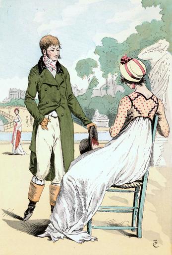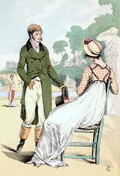 Keywords: On the terrace of the Tuileries, 1798.jpg Artwork This plate depicts a couple in the garden of the Tuileries She is wearing a typical flowing white empire waist dress and a bonnet Over her neo-classical style dress she is wearing a 'spencer jacket' thought to be especially flattering of the fashionable tiny waist He is wearing a green riding coat and riding boots 1898 colored plate 10 x 15 cm Institution Brown University Library object history exhibition history credit line Published in Octave Uzanne Fashion in Paris the various phases of feminine taste and aesthetics from 1797 to 1897 London William Heinemann 1898 accession number 1145807865709771 PD-old Les modes de Paris 003 Fashion plates depicting men Images of Paris from the Brown University Library 1798 in Paris 18th-century people of Paris Fashion in 1798 Jardin des Tuileries in art Females with white dresses in art 1790s dresses Spencer jacket |
