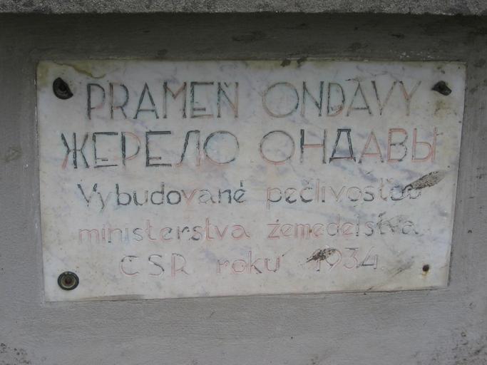 Keywords: Ondava spring 2.jpg Ondava spring in the village of Ondavka Bardejov county Slovakia The table says Ondava spring in Slovak and Rusyn Built by Ministry of Agriculture of Czechoslovak Republic in 1934 Źródło Ondavy we wsi Ondavka powiat bardejovski Słowacja own 5 VIII 2006 User PM / pl Wikipedysta P Ondava Springs of Slovakia Plaques referencing 1934 Multilingual signs in Slovakia |