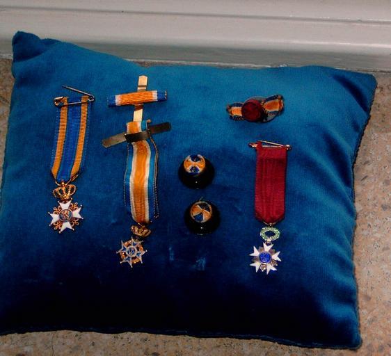 Keywords: Onderscheid1.jpg A mixed bag of miniatures of Dutch and Belgian decorations They are A miniature of the Order of the Dutch Lion reverse A miniature of the Order of Orange-Nassau reverse the gilden on the cross indicates that is must have belonged to an Officer a Commander Grand-Officer or Grand-Cross Two round rozetten of an Officer in the Order of Orange-Nassau An unapproved combination of the rossette of the Belgian Order of the Crown and the ribbon of the Order of Orange Nassau A combination like this is not encouraged by the Dutch protocol and the Chancellor of the Orders but many knights decided to wear them nonetheless A Miniature of the Order of the Crown Belgium reverse The elongated ribbin in blue white and orange it looks like a baton is an old-fashioned insignia of a Knight in the Order of Orange-Nassau It is not an approved manner of wearing a ribbon but it used to be quite common The miniatures are worn with a mess jacket or black-tie The rozettes are worn on the lapel of a suit Correction by 15 49 22 November 2008 UTC own We El Orders of the Netherlands |