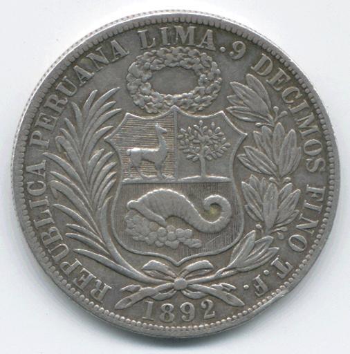 Keywords: One-sol-1892-(01)-back.png 2005-08-31 own assumed Haylli es Reverso de una pìeza de un sol Perú de plata emitida en 1892 por el Banco Central de Reserva del Perú La imagen contiene un representación del escudo nacional nacionalidad lugar y año de emisión así como la ley de la pieza 9/10 plata Especimen monetario escaneado por Haylli en agosto de 2005 Imagen en el Dominio Público debido a la antigüedad de la pieza 1892 coins Coins of Peru |