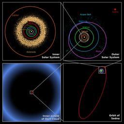| Keywords: Oort cloud Sedna orbit.svg These four panels show the location of trans-Neptunian object 90377 Sedna which lies in the farthest reaches of the Solar System <ref>http //www spitzer caltech edu/Media/releases/ssc2004-05/release shtml Most Distant Object in Solar System Discovered Press release Jet Propulsion Laboratory March 15 2004 </ref> Each panel moving clockwise from the upper left successively zooms out to place Sedna in context The first panel shows the orbits of the inner planets and Jupiter; and the asteroid belt In the second panel Sedna is shown well outside the orbits of Neptune and the Kuiper belt objects Sedna's full orbit is illustrated in the third panel along with the object's location in 2004 nearing its closest approach to the Sun The final panel zooms out much farther showing that even this large elliptical orbit falls inside what was previously thought to be the inner edge of the spherical Oort cloud a distribution of cold icy bodies lying at the limits of the Sun's gravitational pull Sedna's presence suggests that the previously speculated inner disk on the ecliptic does exist SVG version of Image Oort cloud Sedna orbit jpg which lists the following sources http //photojournal jpl nasa gov/catalog/PIA05569 http //ipac jpl nasa gov/media_images/ssc2004-05c_medium jpg http //www spitzer caltech edu/images/2638-ssc2004-05d-Orbit-Comparisons Splitzer Space Telescope Released Images about Sedna March 15 2004 original image August 2006 SVG conversion Image courtesy of NASA / JPL-Caltech / R Hurt Original text courtesy of NASA / JPL-Caltech SVG conversion by Holek Public domain see below Oort cloud Sedna orbit pt svg Oort cloud Sedna orbit-ar png Oort cloud Sedna orbit-fr svg Oort cloud Sedna orbit-vi svg Oort-wolk Sedna wentelbaan svg Oort cloud Sedna orbit-es svg Oort cloud Sedna orbit zh-cn svg Oort cloud Sedna orbit zh-hk svg Oort cloud Sedna orbit zh-tw svg JPEG version French version <references/> The original image PD-USGov-NASA SVG version Oort cloud Sedna Solar System Chart |