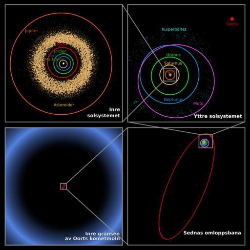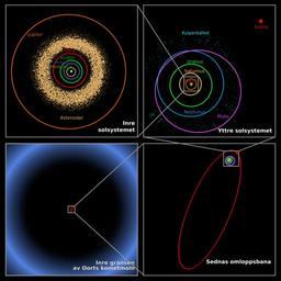 | Keywords: Oort cloud Sedna orbit sv.svg  Swedish translation of File Oort cloud Sedna orbit svg Dessa fyra rutor visar positionen för det transneptunska objektet 90377 Sedna vilken befinner sig i utkanten av solsystemet Varje ruta zoomar successivt ut for att ge ett sammanhang http //commons wikimedia org/wiki/File Oort_cloud_Sedna_orbit svg Image courtesy of NASA / JPL-Caltech / R Hurt Original text courtesy of NASA / JPL-Caltech SVG conversion by Holek Translation to Swedish by Njaelkies Lea <span class signature-talk >talk</span> PD-USGov-NASA Oort cloud Sedna |