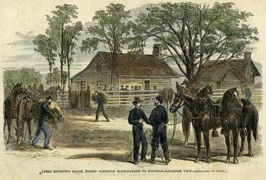 Keywords: outdoor Appeared in May 27, 1865, issue of Harper's Weekly. Print includes the following sketches: Interior of James Bennett's House--Scene of Johnston's Surrender, April 26, 1865 (4 9/16 x 3 3/4), showing interior of house with Johnston and Sherman seated at table; James Bennett's House Where Johnston Surrendered to Sherman--Exterior View (9 3/16 x 6 1/16), exterior view of house and kitchen showing troops (mostly Union) feeding horses and standing around awaiting the end of surrender negotiations; Rebel Small-Arms Turned Over By Johnston's Army to Lieutenant Lyster, Chief of Ordnance, Department of North Carolina, Greensborough, May 3, 1865 (4 9 1/16 x 3 3/4), interior view of store or public building filled with stacks of small arms; and Accoutrements of Johnston's Army Turned Over to J. S. Clingman, Ordnance Office, Department North Carolina, May 3, 1865 (4 9/16 x 3 3/4), showing interior of warehouse filled with piles of accoutrements with Union soldier looking on. From Original Prints, Audio Visual Materials, Special Collections, State Archives of North Carolina. Appeared in May 27, 1865, issue of Harper's Weekly. Print includes the following sketches: Interior of James Bennett's House--Scene of Johnston's Surrender, April 26, 1865 (4 9/16 x 3 3/4), showing interior of house with Johnston and Sherman seated at table; James Bennett's House Where Johnston Surrendered to Sherman--Exterior View (9 3/16 x 6 1/16), exterior view of house and kitchen showing troops (mostly Union) feeding horses and standing around awaiting the end of surrender negotiations; Rebel Small-Arms Turned Over By Johnston's Army to Lieutenant Lyster, Chief of Ordnance, Department of North Carolina, Greensborough, May 3, 1865 (4 9 1/16 x 3 3/4), interior view of store or public building filled with stacks of small arms; and Accoutrements of Johnston's Army Turned Over to J. S. Clingman, Ordnance Office, Department North Carolina, May 3, 1865 (4 9/16 x 3 3/4), showing interior of warehouse filled with piles of accoutrements with Union soldier looking on. From Original Prints, Audio Visual Materials, Special Collections, State Archives of North Carolina. |