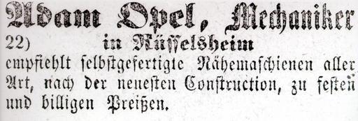 Keywords: Opel Werbeanzeige 1863.jpg Adam Opel aus dem GroĆ-Gerauer Kreisblatt vom 10 April 1863 Adam Opel s first sewing machine advertisement of 1863 Anzeigenblatt des GroĆherzoglichen Kreisamtes GroĆgerau 10 April 1863 http //media opel de/content/media/de/de/opel/photos modal 8 id 5724 html/content/dam/Media/images/INTL/opel/history/history-1862-1899/1868-Opel-Ruesselsheim-30997 jpg/1372949165592 html Scan Author 1863-04-10 Adam Opel Mechaniker in Rüsselsheim empfiehlt selbstgefertigte NƤhemaschienen aller Art nach der neuesten Construction zu festen und billigen PreiĆen 1863 advertisements Opel sewing machines PD-old |