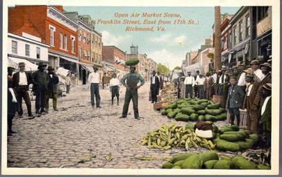| Keywords: vcu libraries vculibraries vcu digital collections vcudigitalcollections road outdoor photo border Description: [Note: The description text is a verbatim transcription of the printed postcard text, and is a reflection of the historical time and place]. The music of a band and the 'meat' of a water-melon are irresistibly attractive to the average Virginia 'darky,' hence his predominance in this view. From the surrounding country-site the produce of truckers and hucksters is hauled to the city, usually in small two-wheel canvas covered carts, and the disposal thereof for sale, in the streets adjacent to the public markets, presents an interesting and characteristic scene. Manufacturer: Southern Bargain House, Richmond, Va. Date Postmarked: Not postmarked. Rights: This item is in the public domain. Acknowledgement of the Virginia Commonwealth University Libraries as a source is requested. Reference URL: dig.library.vcu.edu/u?/postcard,398 Collection: Rarely Seen Richmond: Early twentieth century Richmond as seen through vintage postcards Description: [Note: The description text is a verbatim transcription of the printed postcard text, and is a reflection of the historical time and place]. The music of a band and the 'meat' of a water-melon are irresistibly attractive to the average Virginia 'darky,' hence his predominance in this view. From the surrounding country-site the produce of truckers and hucksters is hauled to the city, usually in small two-wheel canvas covered carts, and the disposal thereof for sale, in the streets adjacent to the public markets, presents an interesting and characteristic scene. Manufacturer: Southern Bargain House, Richmond, Va. Date Postmarked: Not postmarked. Rights: This item is in the public domain. Acknowledgement of the Virginia Commonwealth University Libraries as a source is requested. Reference URL: dig.library.vcu.edu/u?/postcard,398 Collection: Rarely Seen Richmond: Early twentieth century Richmond as seen through vintage postcards |