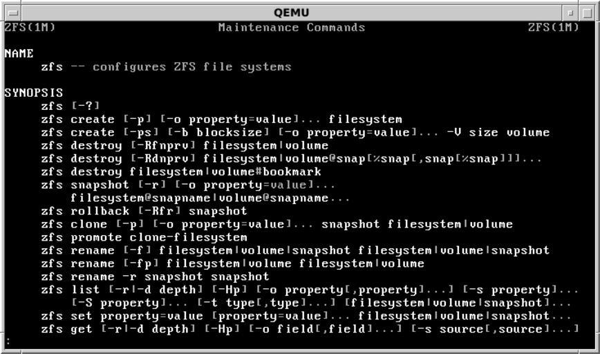 | Keywords: OpenIndiana 2015 Console ZFS.png  en OpenIndiana snapshot from October 2015 showing the manual page for the zfs command OpenIndiana is an open-source descendant of SVR4 and the Solaris operating system through the now-defunct OpenSolaris 2015-10-23 own Huihermit other versions cc-zero OpenIndiana Uploaded with UploadWizard |