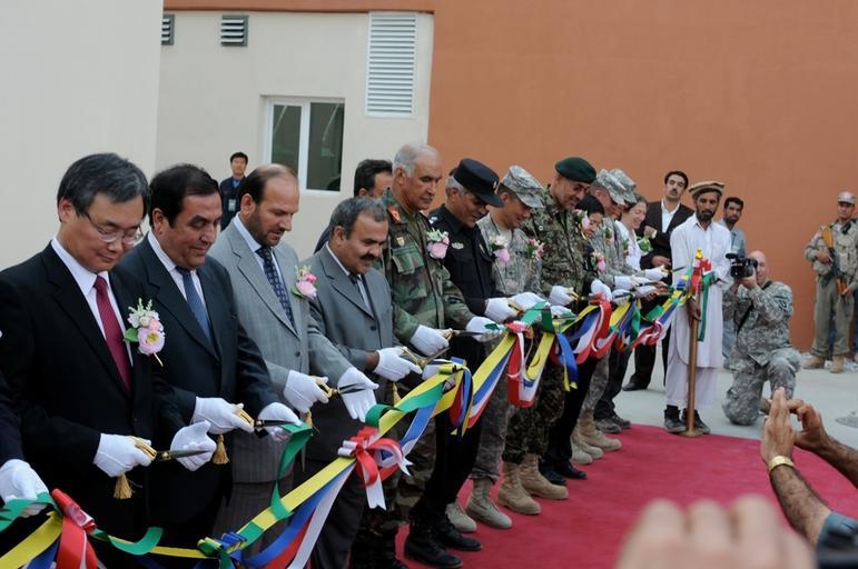 Keywords: Opening ceremony DVIDS269240.jpg en Delegates from Afghanistan the Republic of Korea and the U S cut the ribbon during the opening ceremony for the Korean Provincial Reconstruction Team's Hospital and Vocational Training Center at Bagram Airfield Afghanistan April 11 According to the Ministry of Foreign Affairs and Trade the hospital has two operating rooms and 30 beds and will be capable of treating up to 150 patients per day on average while also offering medical vocational training to local students The job training center will provide training to Afghans focusing on several areas including construction automobile and computers according to the ministry 2010-04-14 Sgt John Young https //www dvidshub net/image/269240 269240 2010-04-14 17 38 BAGRAM AIR FIELD AF PD-USGov Bagram Air Base Images from DoD uploaded by Fæ |