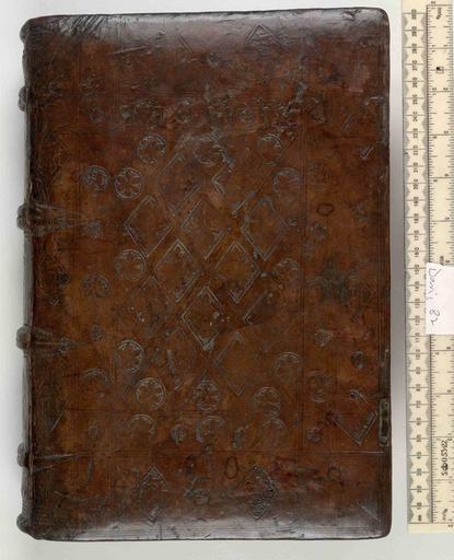 | Keywords: Opera - Upper cover (Davis82).jpg Style Panel design; Caption Upper cover; Colour Brown; Edge Ink ms note Plain exhibition history Decorative Technique Tooled in blind; Cover Material Calf Wooden boards Remnants of 2 pairs of clasps catching on to the lower cover The tooling features the rebus which represents the binder's name Parchment manuscript pastedowns and endleaves There is an ink ms note of Richard Gossinuillius at the end of the text and ms annotations towards the beginning of the text object history Text 1492; Nuremberg; Unspecified object type Cc-zero place of creation Binding England place of discovery See M M Foot The Henry Davis Gift vol II London 1983 p31 G D Hobson English bookbindings in the Abbey Library number 1 J B Oldham English blind stamped bookbindings p28 G D Hobson English bookbindings before 1500 p 23 British Library image http //www bl uk/catalogues/bookbindings/LargeImage aspx RecordId 020-000002066 ImageId ImageId 40638 Copyright BL Opera Uploaded with GWToolset Opera - Upper cover Davis82 http //www webarchive org uk/bldatasets/bindings/5765_4 jpg Bookbinding 15th-century bookbinding British Library Bookbindings |
