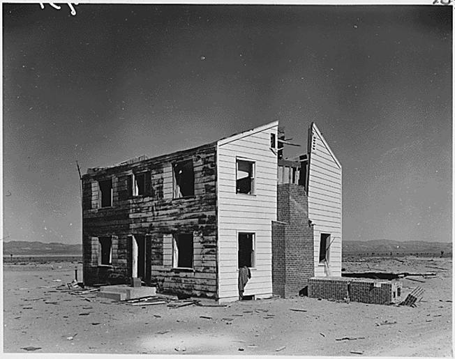 MAKE A MEME View Large Image Production Date: May 5, 1955 Creator(s): Federal Civil Defense Administration. Operations Group. (1951 - 1958) [Operation Cue] - Two-story wood frame house at 5,500 feet after the blast, 05/05/1955 (ARC ID 541788); Photographs of Operation ...