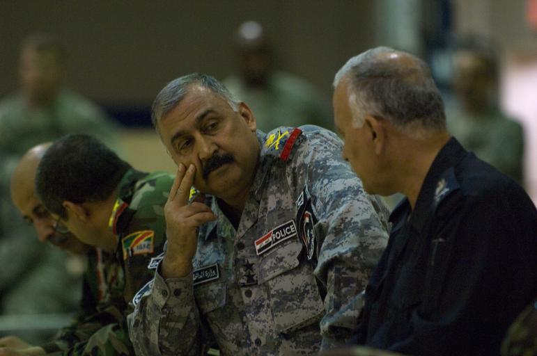 Keywords: Operation Glad Tidings of Benevolence Begins DVIDS106771.jpg en Iraqi police Gen Ghanam converses with a colleague during the combined arms rehearsal for Operation Glad Tidings of Benevolence on July 29 2008 The operation was launched to clear remnants of Al Qaida and other criminal elements from the Diyala province of Iraq 2008-07-29 Petty Officer 2nd Class Paul Seeber https //www dvidshub net/image/106771 080729-N-+++++-050 2008-08-02 17 13 FORWARD OPERATING BASE WARHORSE IQ PD-USGov-Military-Navy Forward Operating Base Warhorse Images from DoD uploaded by Fæ |