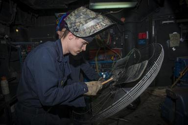 Keywords: Operation Inherent Resolve 150220-N-HD510-029.jpg en 150220-N-HD510-029 ARABIAN GULF Hull Maintenance Technician Fireman Tyler Fath prepares a fan for welding aboard the aircraft carrier USS Carl Vinson Carl Vinson is deployed in the U S 5th Fleet area of operations supporting Operation Inherent Resolve strike operations in Iraq and Syria as directed maritime security operations and theater security cooperation efforts in the region 2015-02-20 Feb 20 2015 https //www dvidshub net/image/1791279 150220-N-HD510-029 2015-02-27 20 03 USS CARL VINSON ARABIAN GULF AT SEA PD-USGov-Military-Navy USS Carl Vinson CVN-70 Images from DoD uploaded by Fæ |
