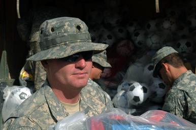 | Keywords: Operation Soccer Craze DVIDS302760.jpg  en U S Army Spc Jimmie Thompson from Columbia S C assigned to Alpha Battery 2nd Battalion 3rd Field Artillery Regiment 1st Brigade 1st Armored Division helps offload a trailer of soccer equipment and uniforms to give to Iraqi children in Dibbis Iraq July 11 2010 The soccer balls and uniforms were provided by friends and family supporting U S soldiers and their humanitarian efforts in Iraq 2010-07-11 Petty Officer 1st Class David Hites https //www dvidshub net/image/302760 100711-N-+++++-001 2010-07-25 01 42 DIBBIS IQ PD-USGov-Military-Navy 1st Armored Division United States Images from DoD uploaded by Fæ |
